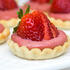 A sweet strawberry tart with a flaky exterior. Topped with whipped cream.
