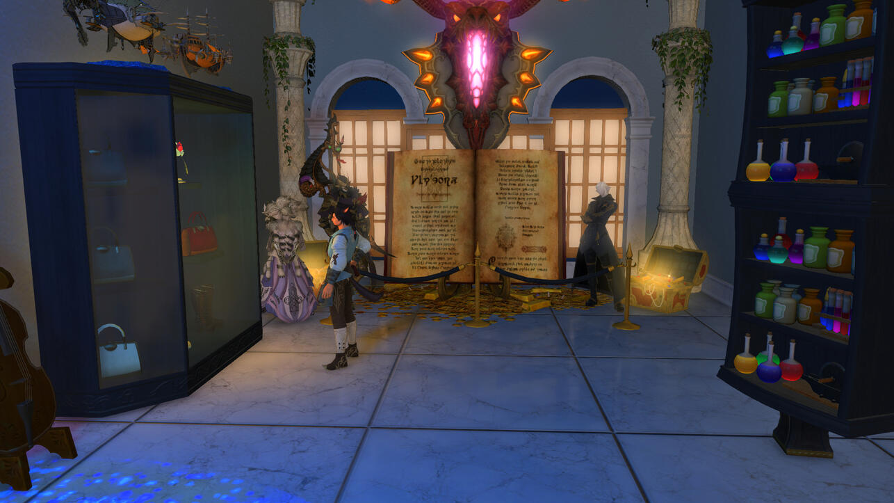 Arcana Obscura is the passion project of the Viscountess Raine Endarin. Owing to the end of the Dragonsong War and her relocation outside of Ishgard proper, the mage decided to put her knowledge of magical history and arcane antiques to profitable use. With the assistance of her husband and the funding of his considerable fortune behind her, a building was purchased and merchandise secured for a high-end boutique nestled in The Goblet's Brimming Heart.Two years later, the shop is flourishing. Paid adventurers bring in a constant influx of rare and unique treasures, and the Lady Endarin-- alsongside her staff--spends most of her days restoring and curating the items in her care.