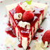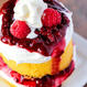 A rich cake of cream and cheese on graham crackers, topped with sweet rolanberry syrup.