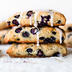 A biscuit-like cake, lightly sweetened and baked with blueberries. Frosted and topped with blueberry syrup.